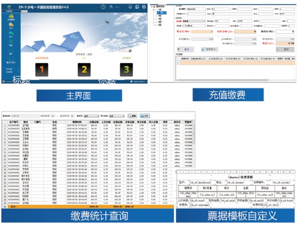 收費(fèi)管理軟件主要實(shí)現(xiàn)開(kāi)戶、充值繳費(fèi)、補(bǔ)卡、換表、銷戶、繳費(fèi)記錄查詢、報(bào)表統(tǒng)計(jì)、票 據(jù)自定義等功能;